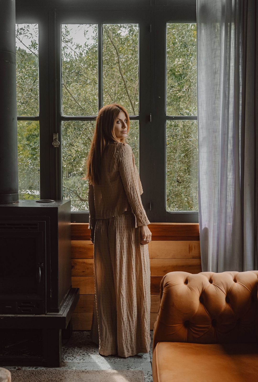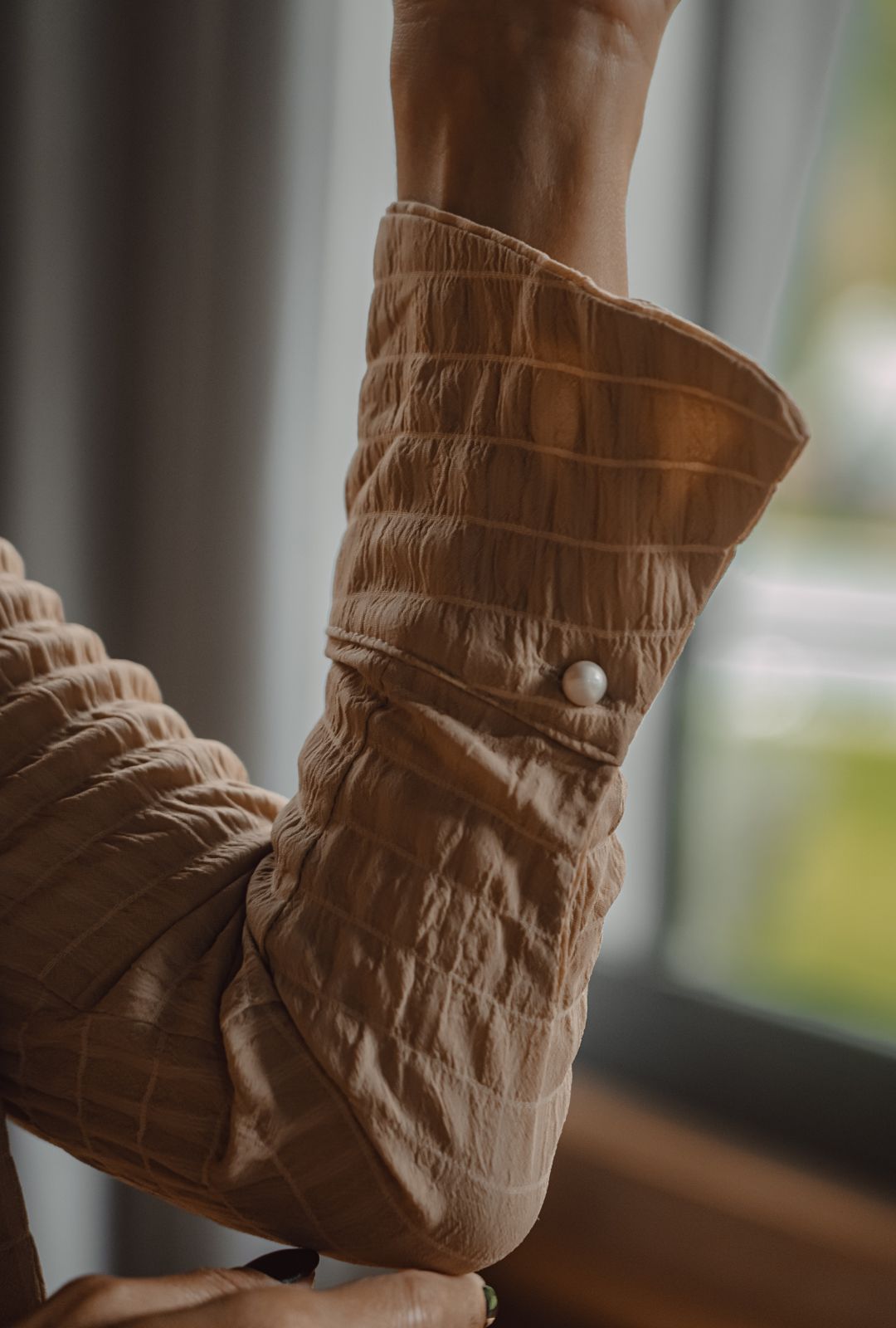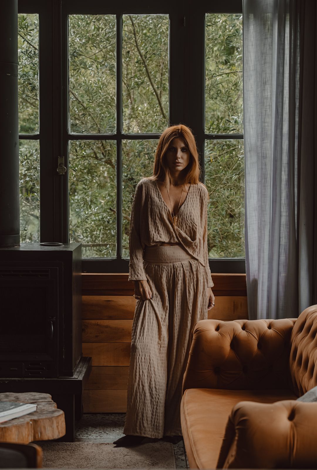 Blusa de modelagem transpassada, com textura e caimento leve. O design valoriza o colo de forma sutil, trazendo elegância e conforto para o uso diário. O comprimento levemente cropped equilibra proporção e modernidade, permitindo combinações versáteis com peças de cintura alta.