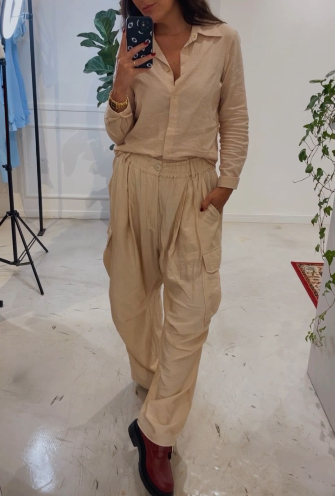 Possui bolsos laterais, estilo cargo.