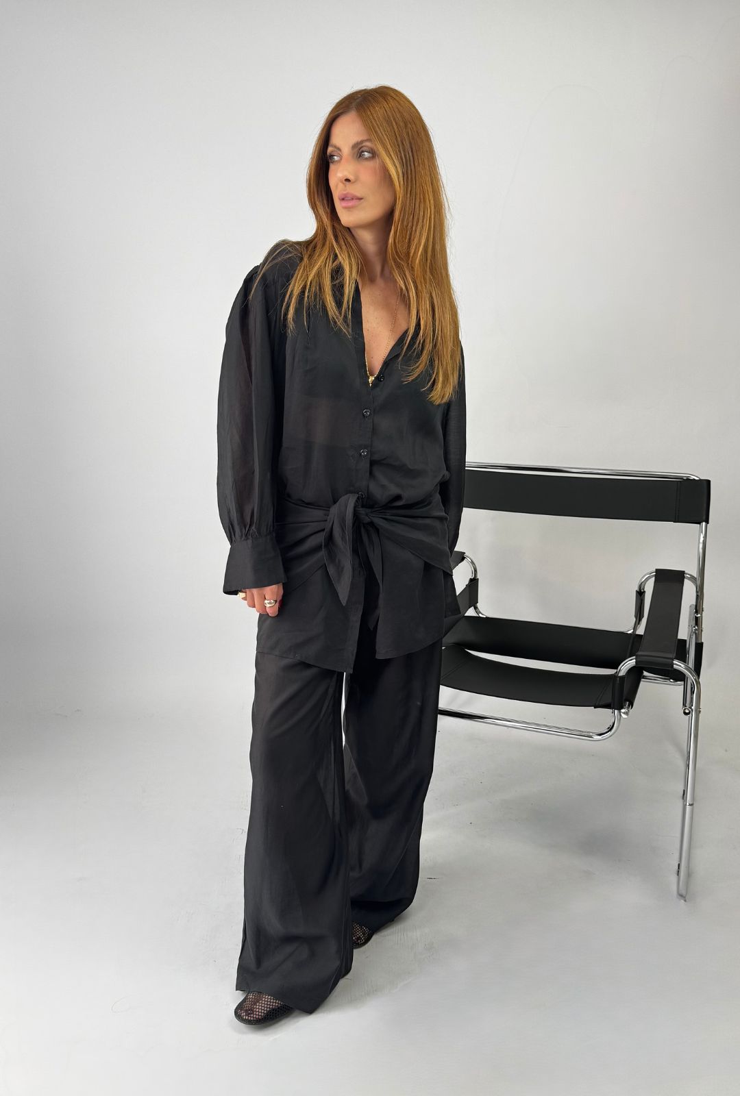 Seu tecido é levemente transparente, criando um movimento sutil e elegante, perfeito para quem aprecia peças que equilibram forma e delicadeza.
