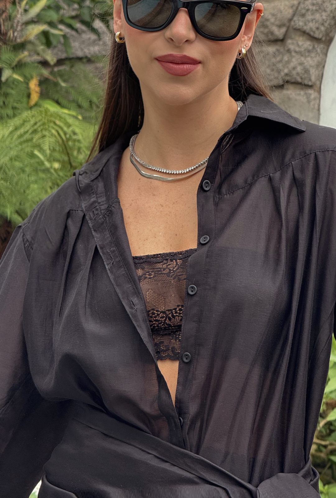As mangas volumosas, somadas à transparência sutil e à gramatura leve do tecido, trazem frescor e estilo para um verão preto nada básico.