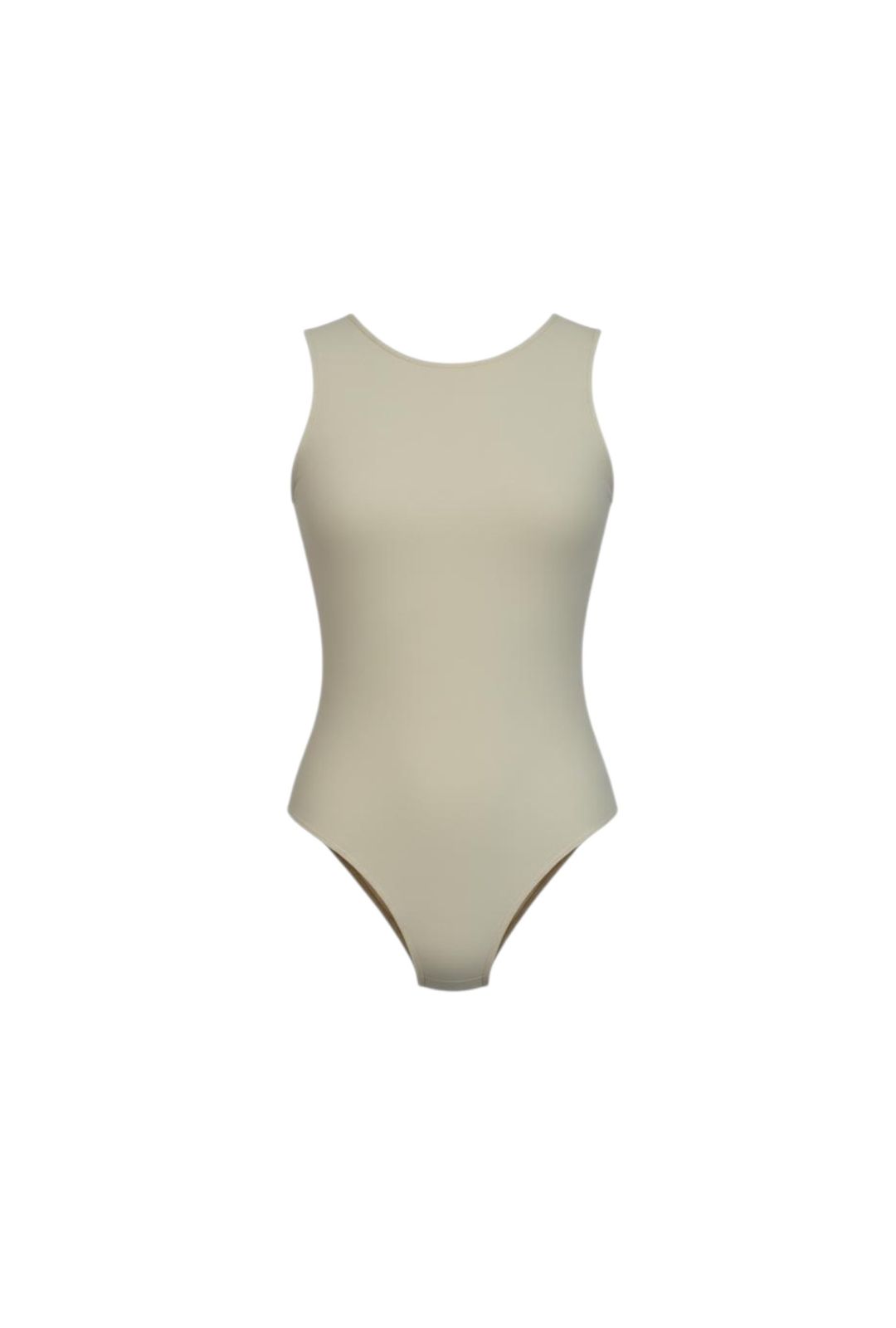 O body tem decote fechado e modelagem limpa, que sustenta e abraça o tronco com suavidade. A cava bem desenhada alonga a silhueta e garante um visual moderno e funcional, ideal tanto para composições completas quanto para usos separados.