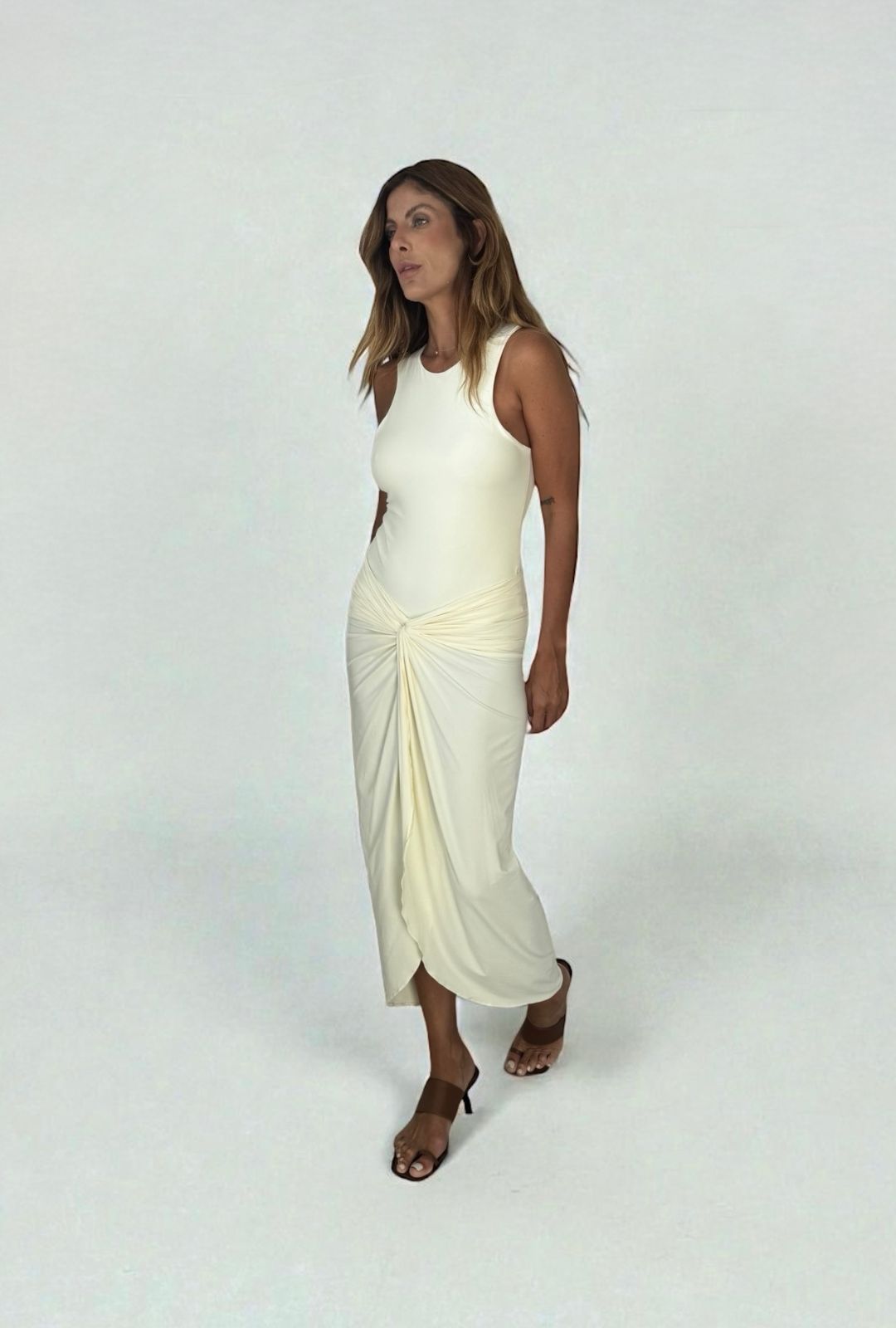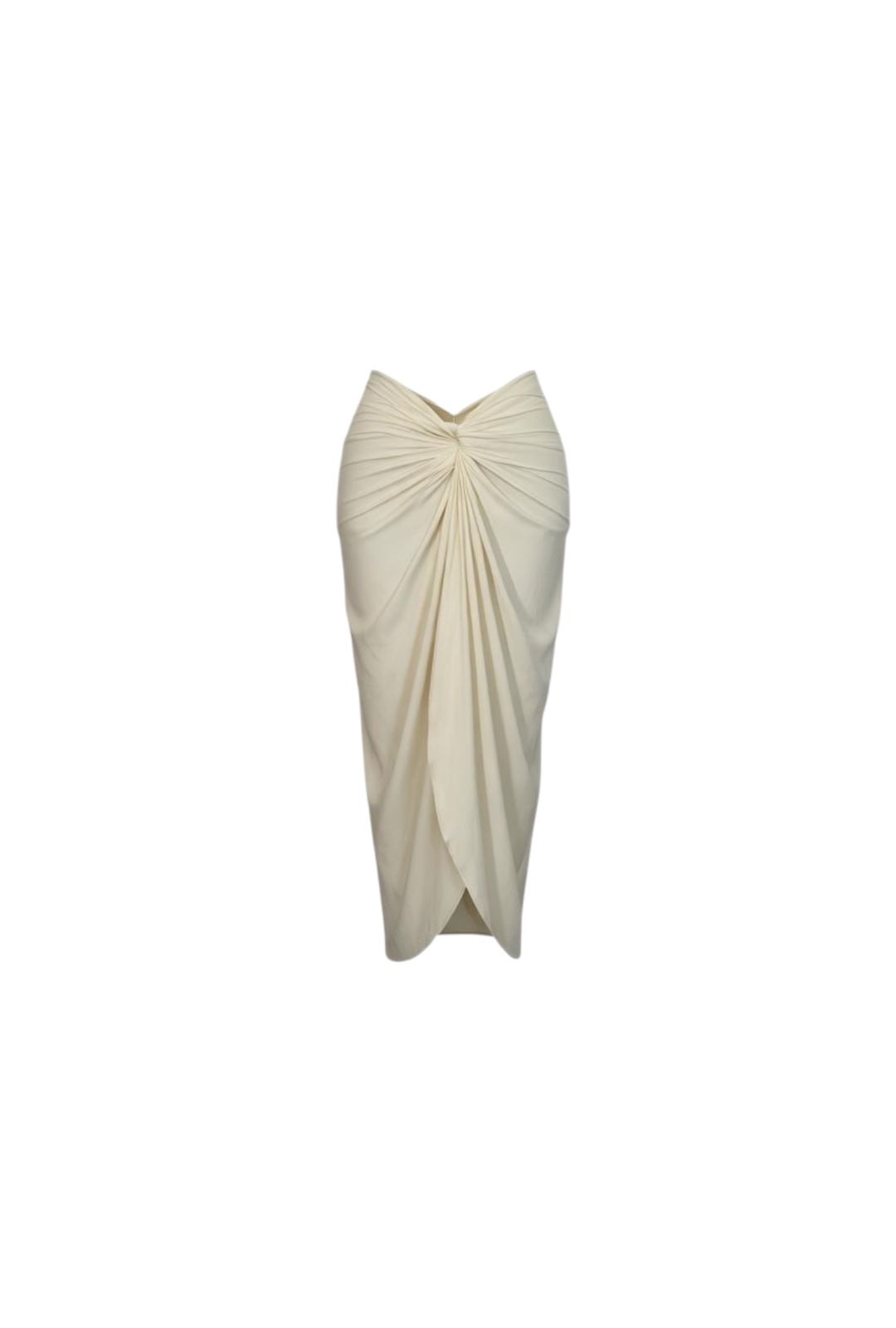 A saia é o ponto de destaque do conjunto. O detalhe torcido cria um jogo de pregas que desenha a cintura e traz movimento à peça, enquanto a fenda discreta adiciona leveza e sensualidade na medida certa. O caimento fluido acompanha o corpo sem marcar excessos.