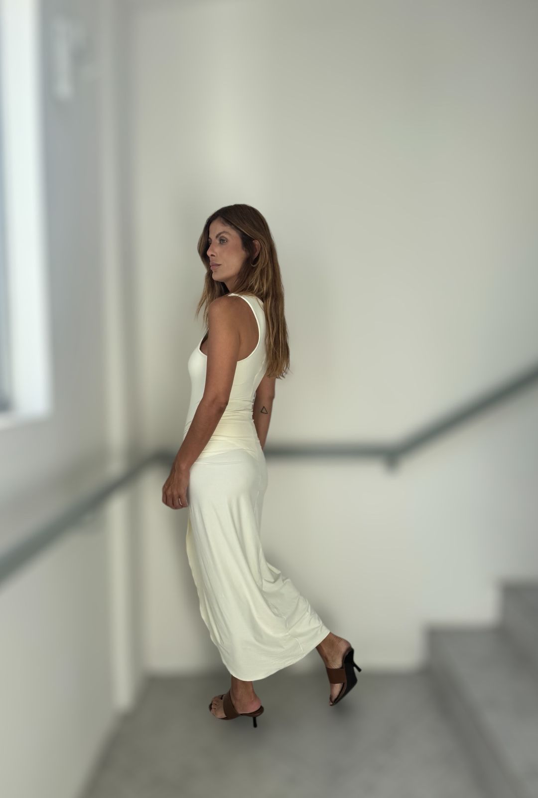 Em tom off white, o Conjunto Vernazza é versátil e atemporal — perfeito para dias quentes, viagens, eventos ao entardecer ou produções urbanas com sandálias, rasteiras ou saltos baixos.