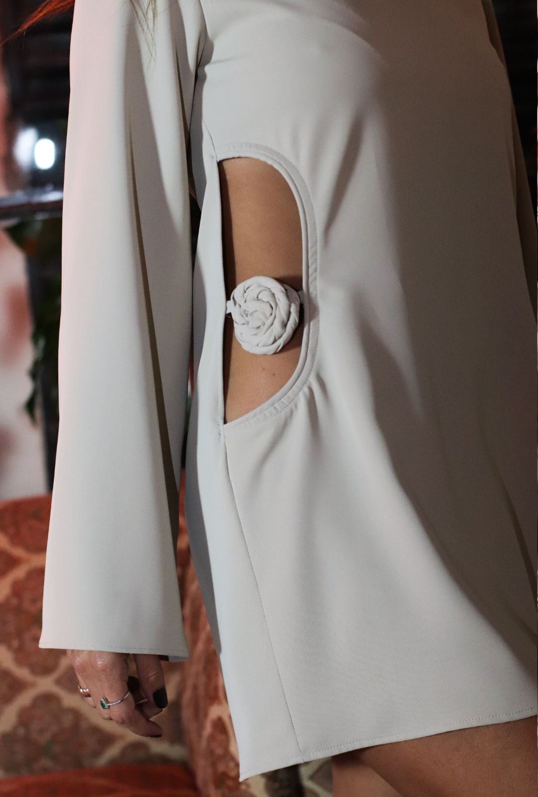 O elemento mais impressionante é, sem dúvida, a flor Camélia, feita manualmente com uma precisão que revela um trabalho minucioso. Cada ponto foi cuidadosamente costurado, dando um toque único e exclusivo à peça.