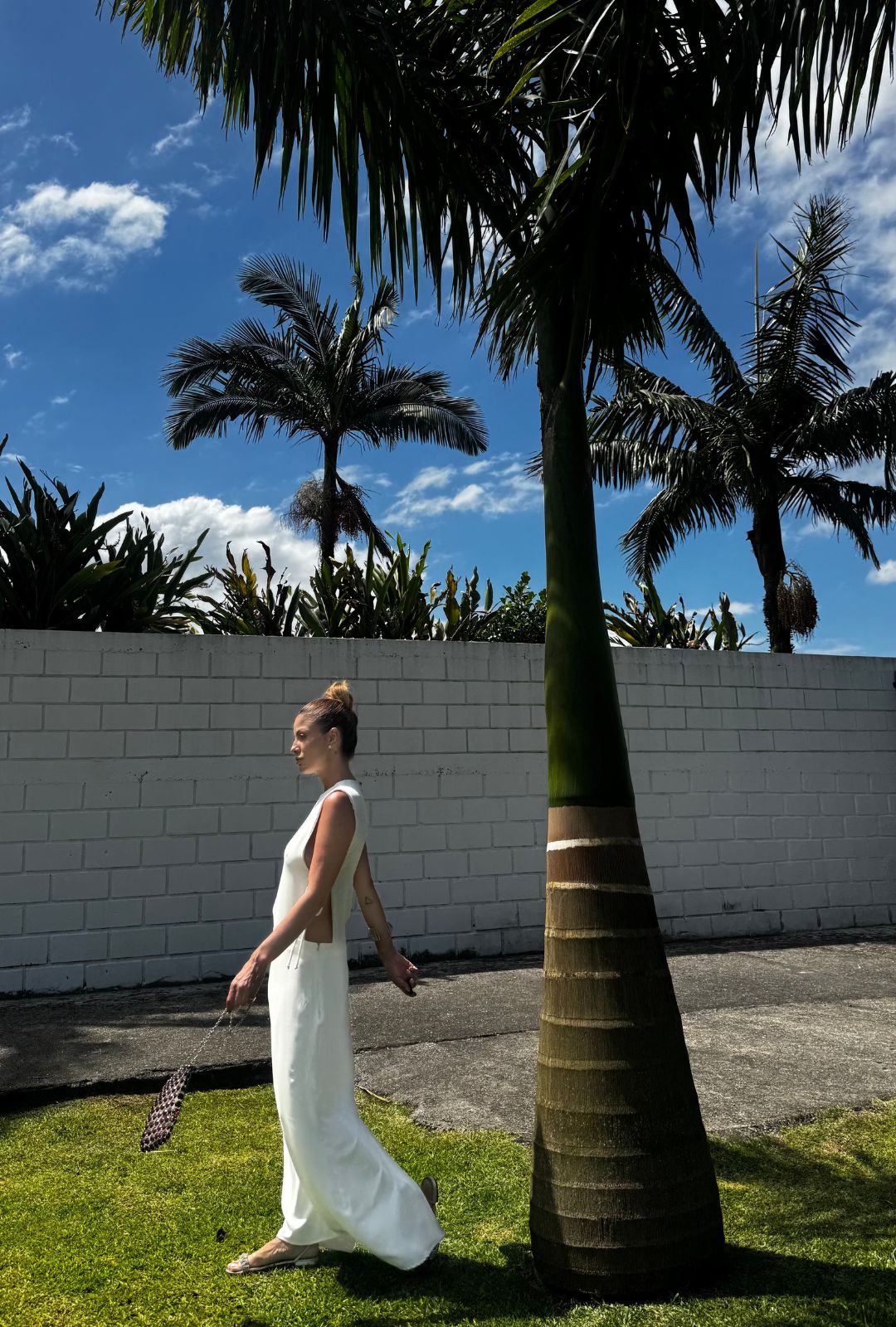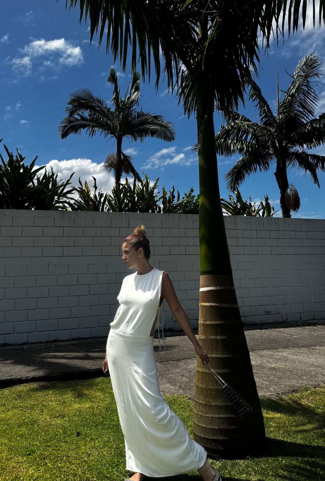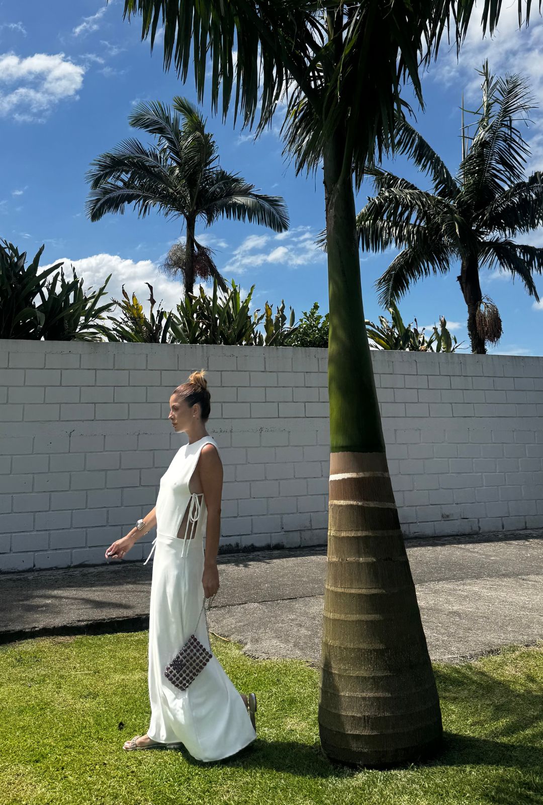 Em modelagem reta e alongada, ele cria uma linha contínua que valoriza a silhueta sem esforço. As laterais abertas com amarração permitem ajuste personalizado e revelam a pele na medida certa, equilibrando simplicidade e impacto.